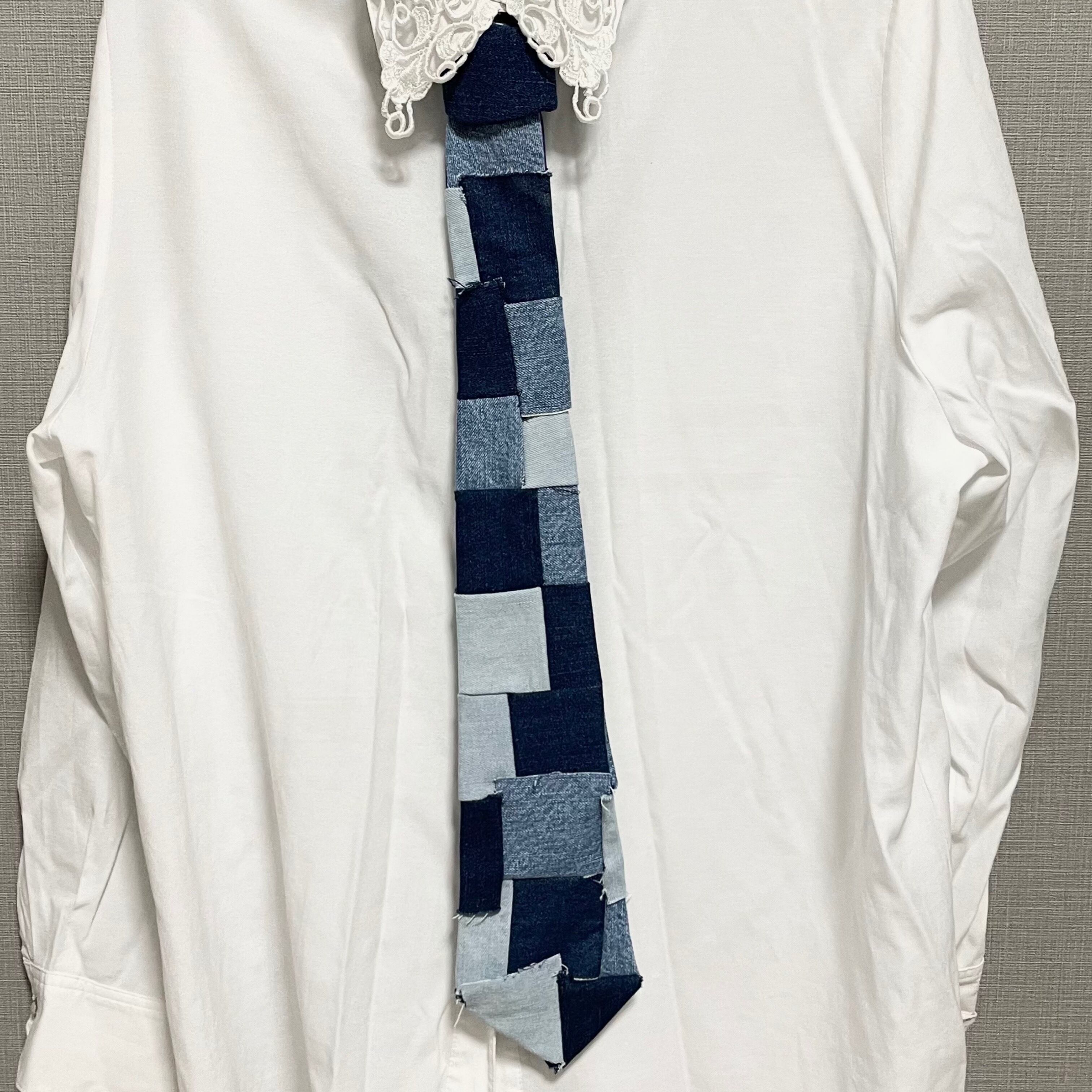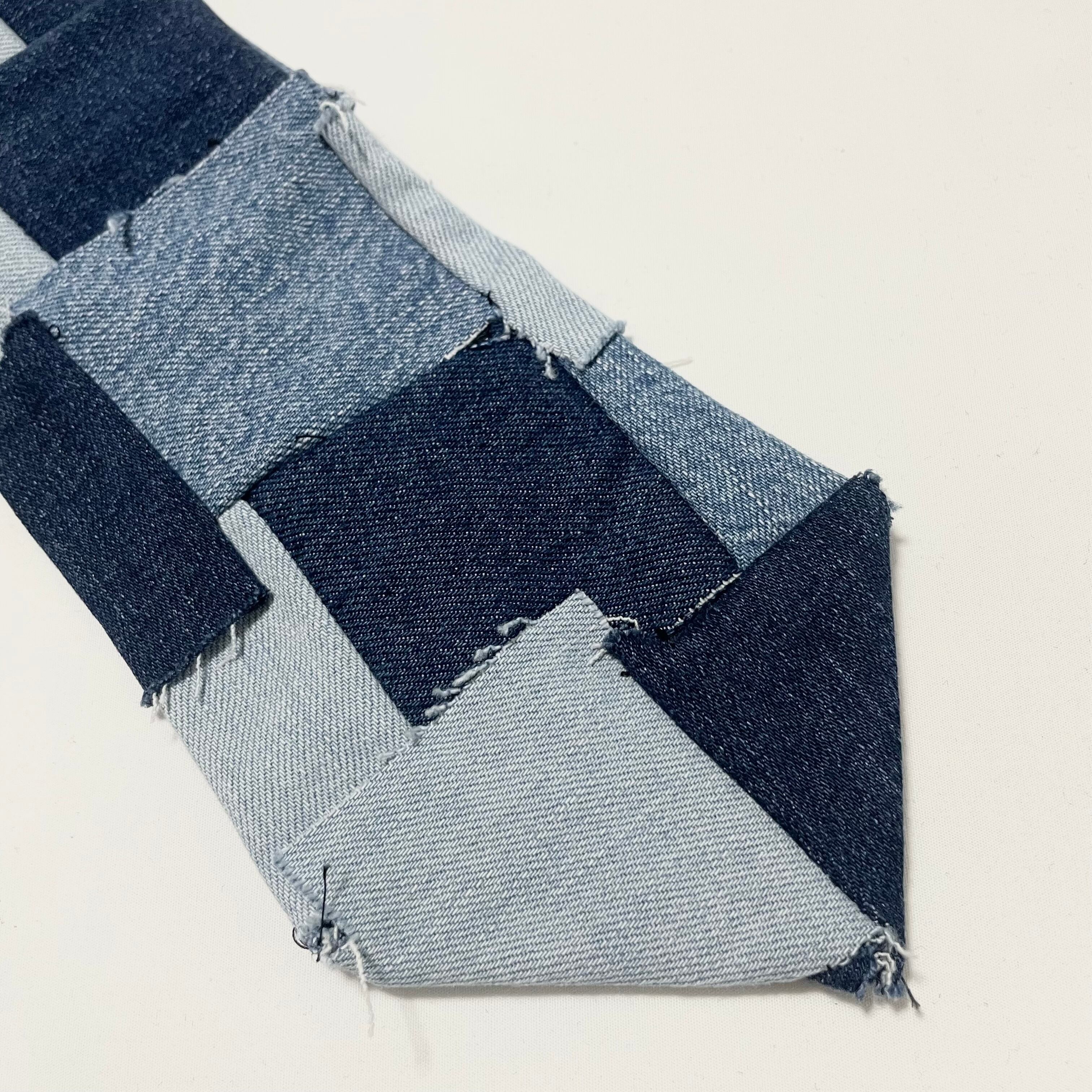 青ベースのデニム地にパッチワークされたデザインは、他にはない個性的なアイテム。